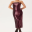 En ankel-lang og elegant julekjole i dyp burgunder med en rett, kroppsnær silhuett. Den har en enkel og sofistikert overdel med rund hals og et glatt, ensfarget stoff som gir et stilrent uttrykk.